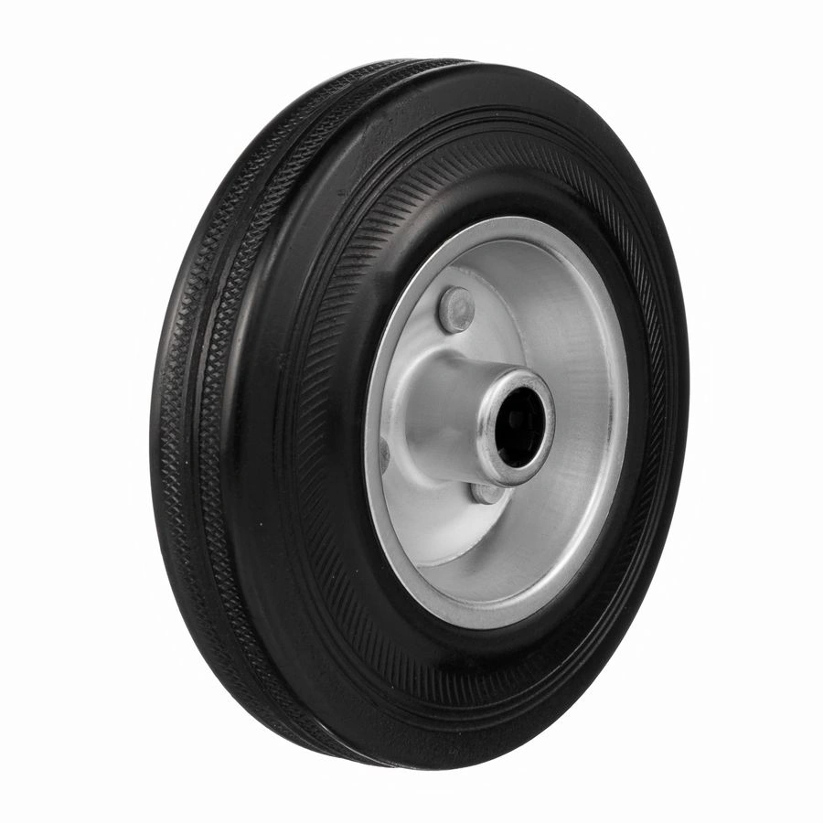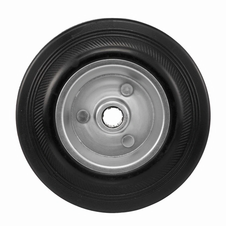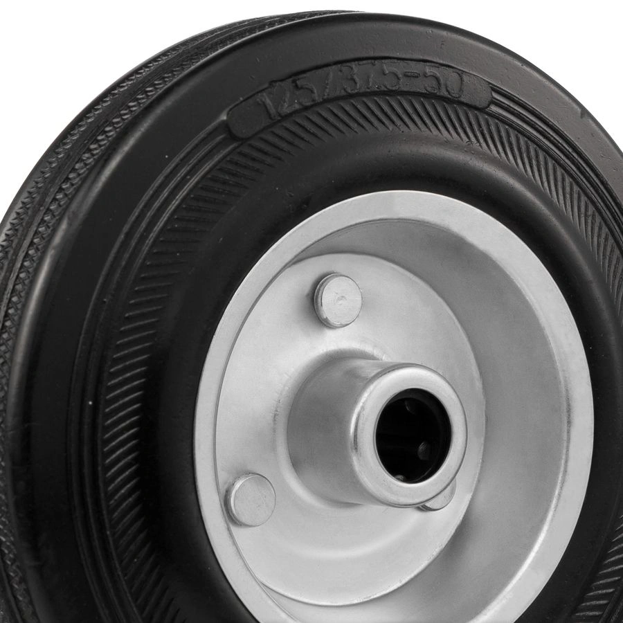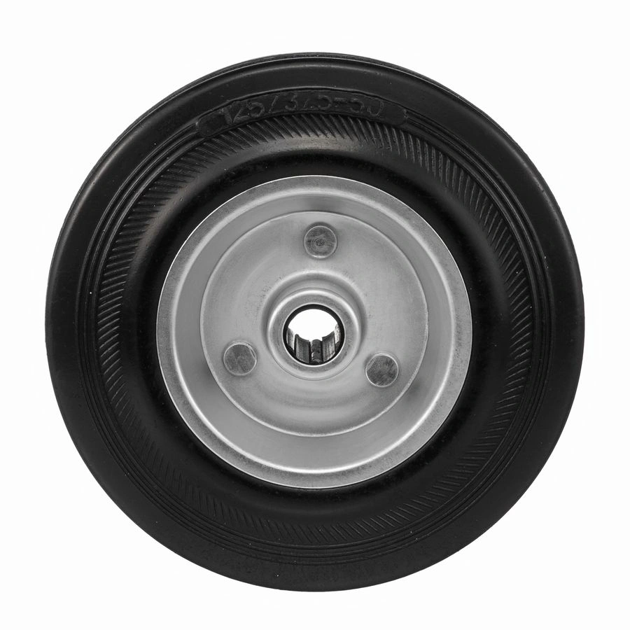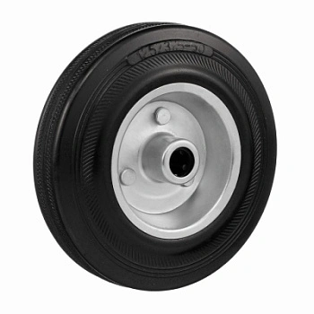 Колесо 4000-125, диаметр125 мм., грузоподъемность 100кг., резина, металл, под ось 15 мм. Колесо из черной литой резины. Центр из стального оцинкованного обода из штампованной стали. В оси колес роликовый подшипник. Колеса из черной резины, центр из двух гальванизированных дисков из штампованной стали. Роликовый (игольчатый) подшипник расположен в углублении, выдавленном под прессом, и содержит цилиндрические ролики подшипника. Возможно применение на относительно грубых полах складов, заводов, производственных и строительных площадках. Данные колеса можно использовать на неровных поверхностях, во влажной окружающей среде и использовании вне помещения, не рекомендуется применять в среде с органическими растворителями, хлорированными веществами, гидрокарбонатами и минеральными маслами. Температура эксплуатации от -20 до +70С.
